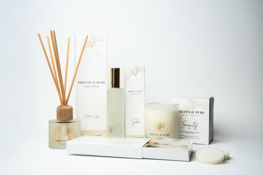 Essential Oil luxury Natural Coconut Wax Candles, Celebration Candles, Wax discs and Reed Diffusers with only 100% Pure Essential Oils & plant extracts and no synthetic fragrances. Our core items are encased in timeless frosted glass to complement all decors and on occasions in different limited edition vessels.